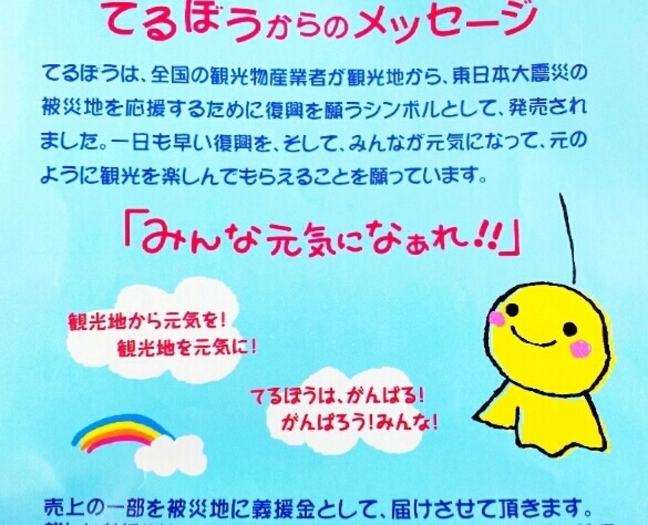 てるぼうは、全国の観光物産業者が観光地から、東日本大震災の被災地を応援するために復興を願うシンボルとして、発売されました。