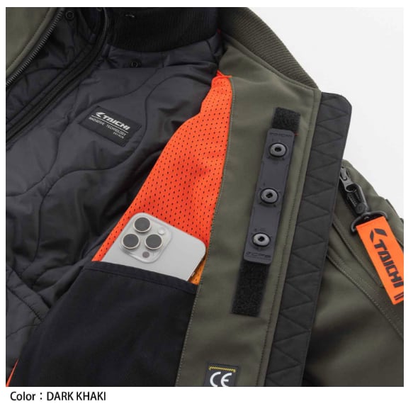 プロテクター内蔵のアウターと保温力をもつ中綿入りインナージャケットの二重構造で、気温やシーンに合わせてそれぞれ単体や組み合わせた着用が可能です。インナージャケットの首元リブには防風フィルムをインサートし、走行中はハイネックスタイルで風の侵入を抑え、降車後は襟を寝かせた着こなしで、それぞれ違ったスタイリングを楽しめます。